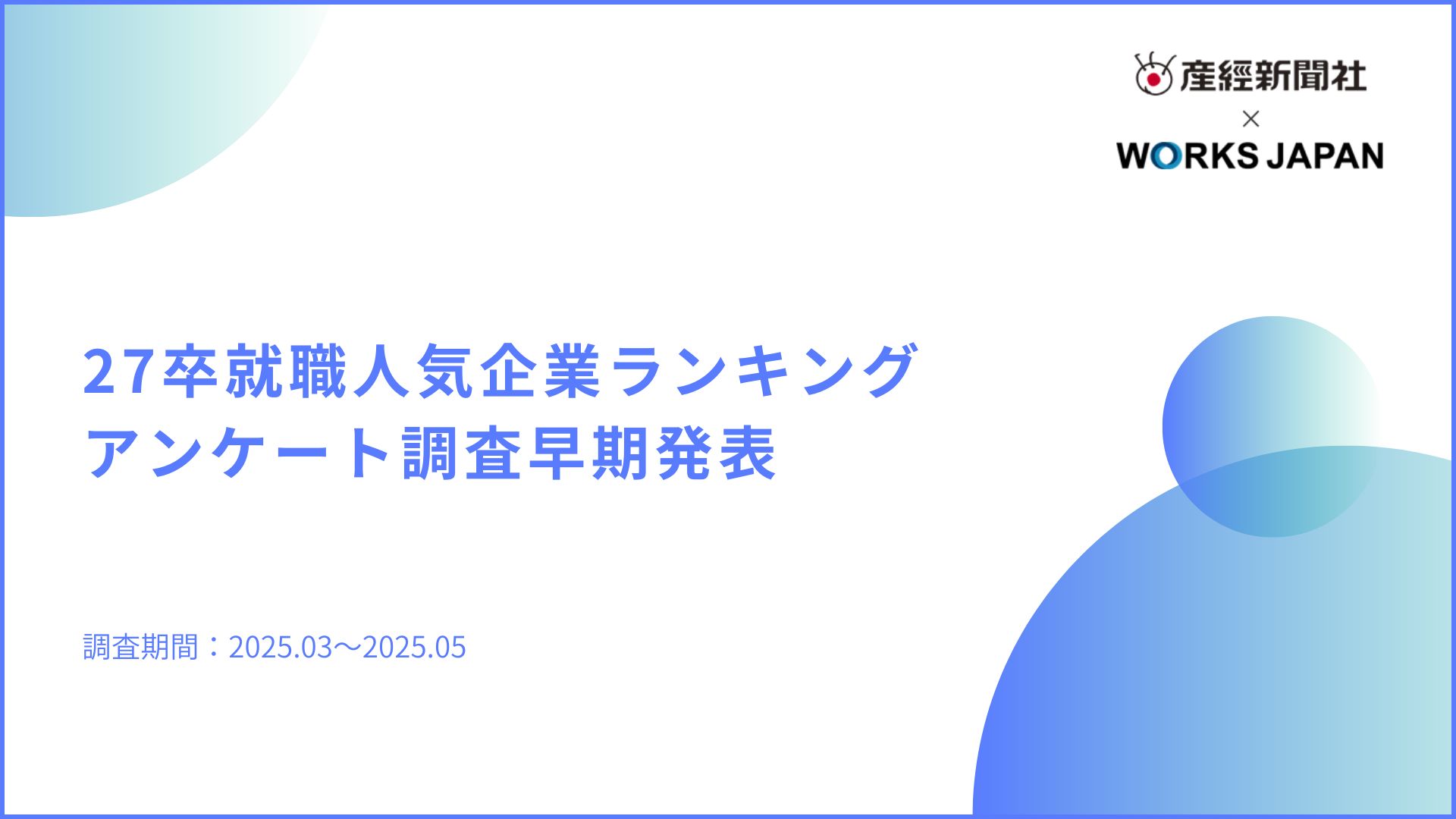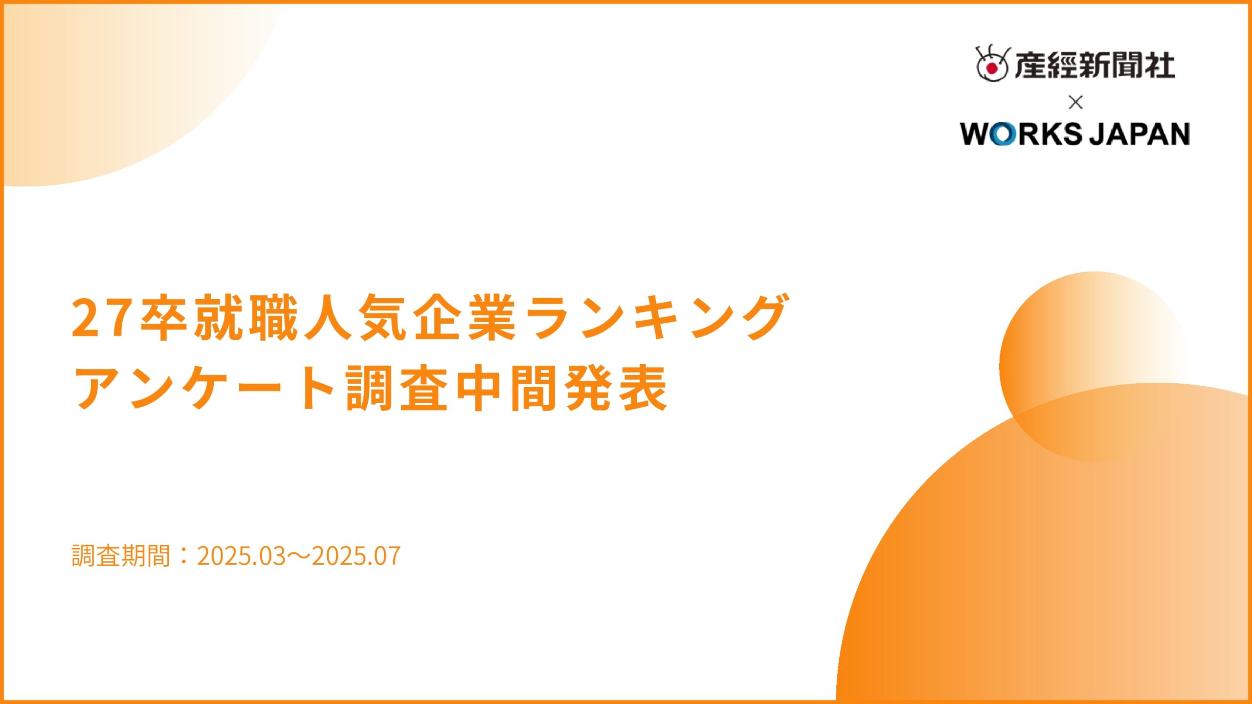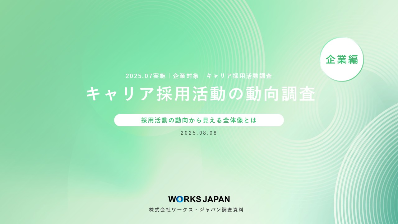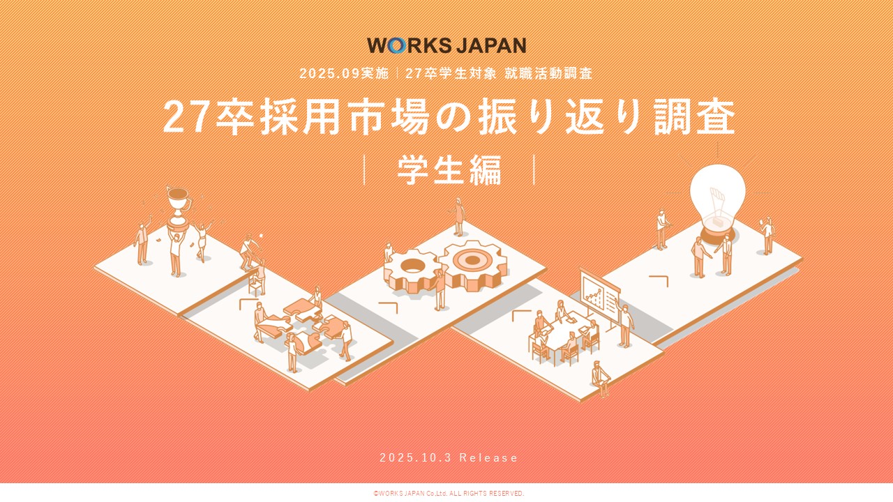 2026.01.30 調査資料 12月時点で学生の約3割が内定保有|ワークス・ジャパン【27卒学生】冬調査 2026.01.19 調査資料 【27卒版】企業選びの本音を調査!就職人気企業ランキングアンケート結果(最終発表)を公開 2026.01.08 調査資料 給与・スキル重視の傾向鮮明、AI活用も5割超え|ワークス・ジャパン キャリア求職者調査 2025.10.16 調査資料 27卒学生の約8割がインターン参加 選考意識が高まる中で採用サイトが情報収集の中心に|ワークス・ジャパン【27卒学生】振り返り調査 2025.09.01 調査資料 【27卒版】夏インターンシップ前の学生を調査!企業選びでの本音アンケート結果を公開 2025.08.14 調査資料 即戦力確保へ注力度高まる 7割超が応募不足と回答|ワークス・ジャパン キャリア採用企業調査 2025.08.05 調査資料 内定までのスピード感が鍵に|ワークス・ジャパン キャリア求職者調査 2025.07.01 調査資料 【27卒版】就職活動前の本音を調査!早期人気企業ランキングアンケート結果を公開 2025.04.14 調査資料 約半数の学生が2年次の秋・冬にインターンシップ参加|ワークス・ジャパン【27卒学生】意識トレンド調査 新卒採用学生動向 2025.01.22 調査資料 12月時点で26卒学生の約3割が内定を保有|ワークス・ジャパン【26卒学生】冬調査 新卒採用学生動向 1 / 41234» 採用広報に関する情報を定期的に受け取りたい方 メールマガジンに登録する