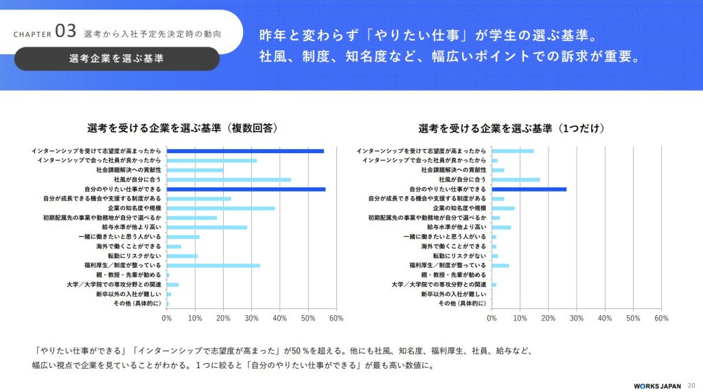 「選考を受ける企業を選ぶ基準」に対する回答で「自分のやりたい仕事ができる」が高い数値であったことから、