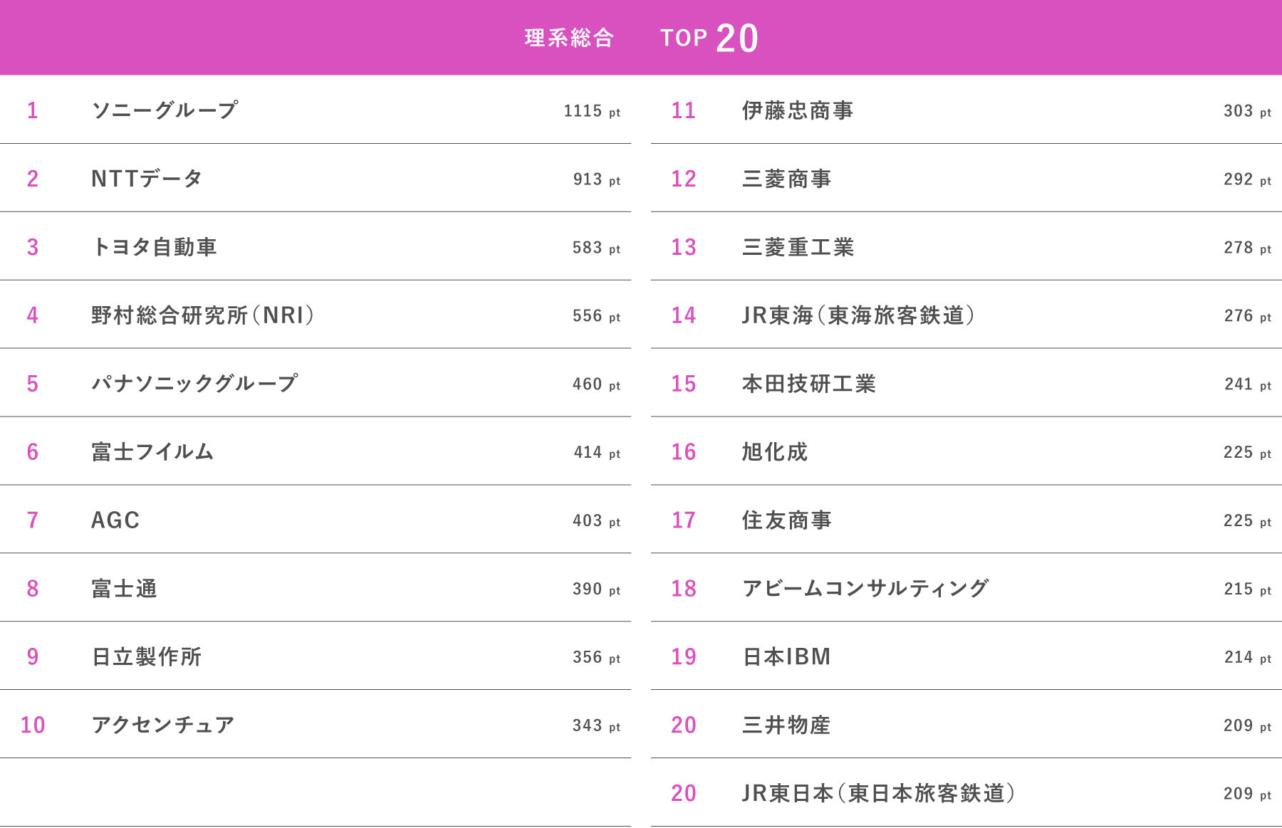 就職を希望する企業ランキングは第1志望から第5志望までの選択方式で、第1志望には5ポイント、第2志望には4ポイント、第3志望には3ポイント、第4志望には2ポイント、第5志望には1ポイントを配分して集計。