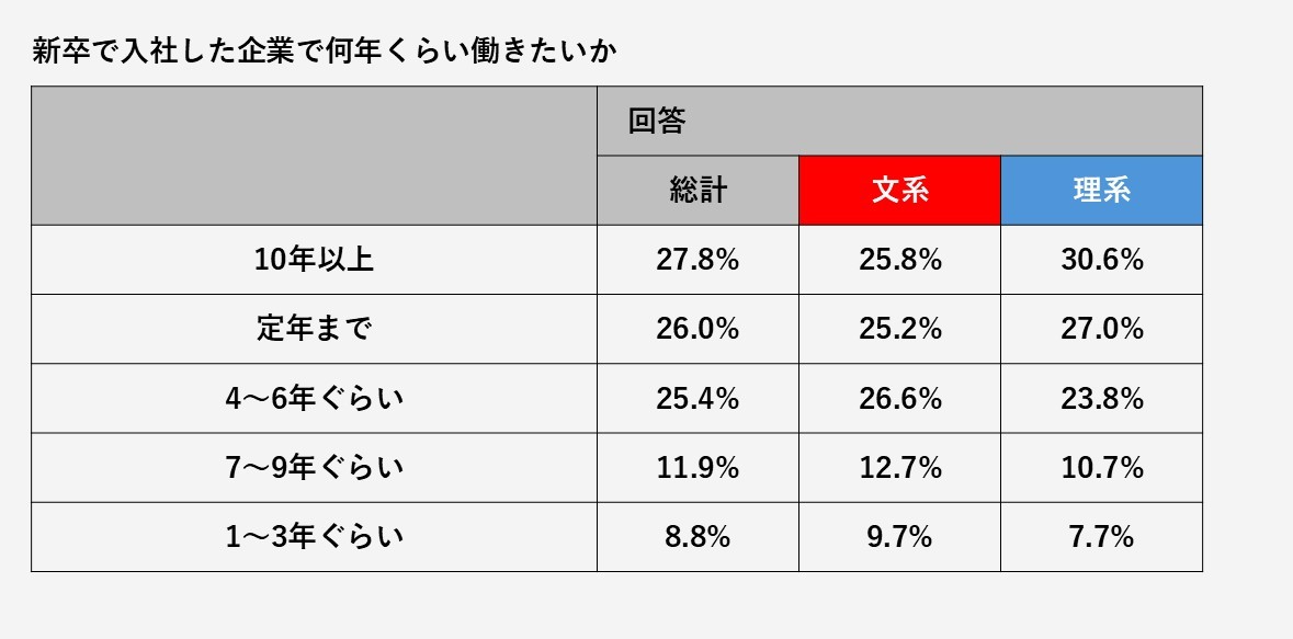 理系は「定年まで」の割合が高く、文系は「4〜6年ぐらい」と柔軟なキャリア設計を考える学生も多いようです。