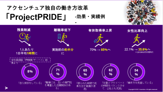 これは我々採用チームが、たくさん採用活動をしていることに加えて、社内の離職率を急激に低下させたというのもあり、その両輪で実現してきた数字になっています。その裏側にある活動が、働き方改革ですね。社内では「Project PRIDE」というふうに呼んでいて、全社員がプロジェクトメンバーですということで、全社員で取り組んでいる活動になります。2015年からこの取り組みをやっているので、かなり長い期間になっていますけれども、フェーズ1からスタートして今フェーズ3で、社内的には3期目に入っているかたちになります。具体的な取り組みは、フェーズ1の場合は非常にベーシックな話でマナーを守りましょう、挨拶をしましょう、定時後に会議は設定しないようにしましょうみたいなところをベースに実施をしていました。今はかなり目線があがって、もっとコラボレイティブに生産性をあげていくためには、どうしたらいいのかというところに主眼を置いて活動しています。こういった取り組みを以て、かなり女性比率もあがってきたり、残業時間が減ったり、離職率が低下してきたりとかということで、非常に成果が出ている活動になっています。