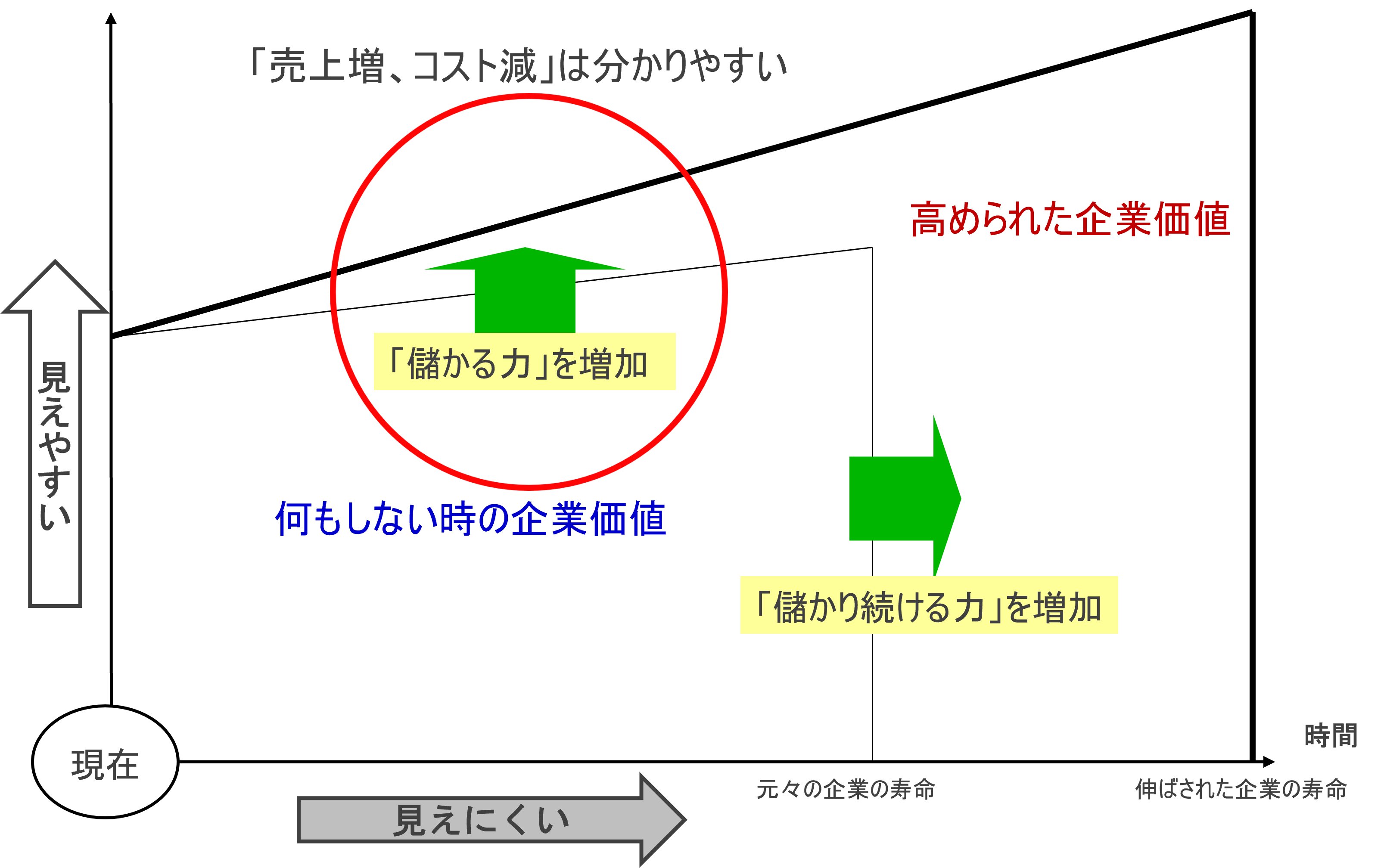 縦が金額、横が時間という図にもしてみました。会社の価値はどれだけ儲かりますかという縦軸金額ですが、横軸はどれだけ儲かり続けますかです。10年より30年、30年より100年葉っぱが成り続けた方が会社の価値は高い。今現在成っている葉っぱと、葉っぱが成り続ける年数をそれぞれ大きくしていくことが会社の目的です。こういうふうにシンプルにしていくと、社員として雇われている私たちは何をすればいいか、ということが考えやすくなります。