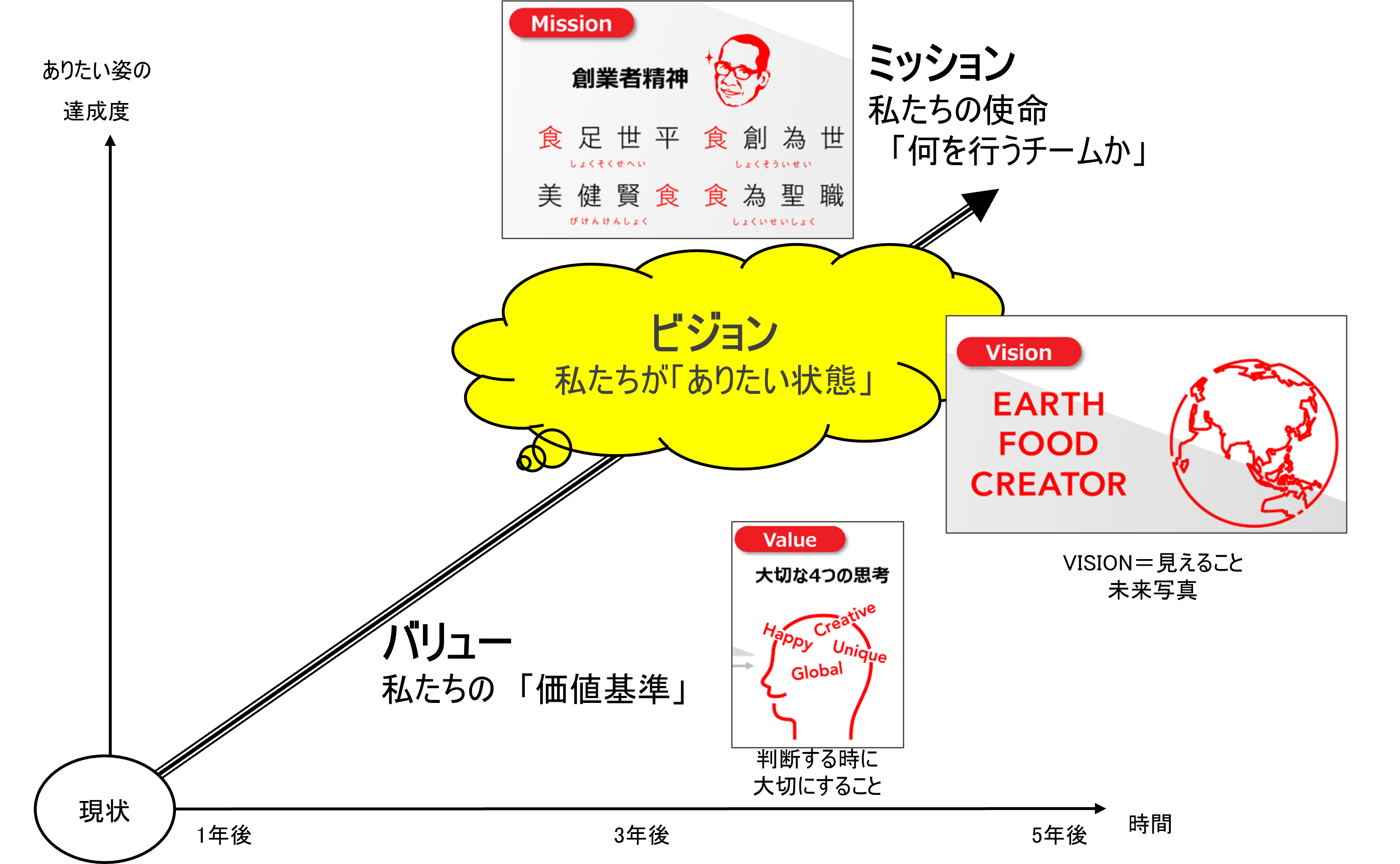 - ただ、ミッション・ビジョン・バリューというカタカナは、自分の中でなんとなく消化しにくかったので、少し考え直してみました。縦軸にありたい姿の達成度、横軸に時間を置きました。45度にパッと伸びていく太い線がミッションです。私たちが日清食品に集ってやりたいことは、いつなんどきでも創業者精神、「食足世平」「食創為世」「美健賢食」「食為聖職」という言葉に繋がります。これが50年先でも100年先でも変わらず続いていくと考えています。ビジョンは目に見える状態のことです。3年後のビジョンもあるし10年後のビジョンもある。毎日いろんな施策を行っていく上で判断基準を求められます。ビジネスだから売れるものを出したい。でも、ただ売れればいいというものではなく、それは必ずユニークなもの、日清らしいものを作らなければなりません。そうでないとお客様が日清に期待することがなくなり、3年後にはつまらない会社になってしまう。だから、判断基準には「長期的」という時間軸が入ってきます。