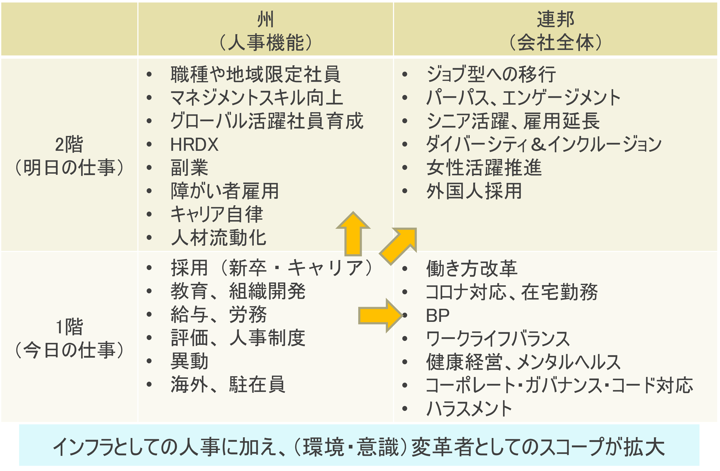 人事の扱う問題・課題を私流に少し整理しました。1階2階、州と連邦といった言葉を使います。今日の仕事を1階、明日の仕事を2階と例えます。それから人事としての必要な機能を州、会社全体を連邦とします。私が13年前もやっていた州の1階部分にある給与、評価、採用などは、必ず必要な今日の仕事です。人事として担わなければならない明日の仕事もあります。州の2階部分にある地域限定社員、マネジメントスキルの向上などです。一方、連邦の1階部分の今日の仕事は、会社全体に関わる働き方改革、コロナ対応などがあります。さらに明日の仕事として連邦の2階部分にはジョブ型への移行、パーパスやエンゲージメントの向上などの課題があります。大小さまざまなテーマが山積しているのです。人事の仕事はインフラと同じで、あって当たり前のものでなかなか感謝されませんが、会社を支えながら、変革者の役割も担っています。