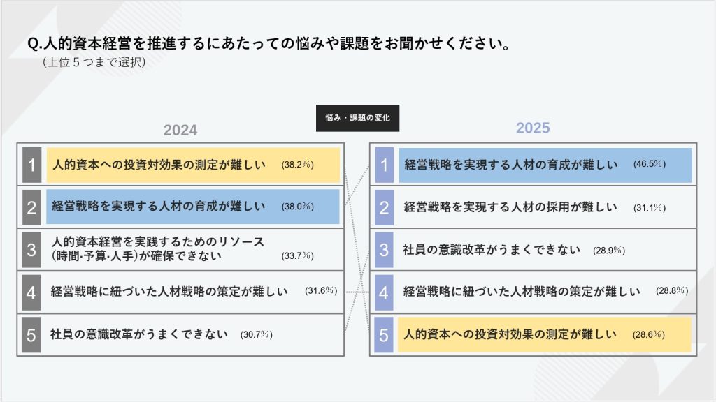 人的資本経営を推進するにあたっての悩みや課題を問う設問では、「経営戦略を実現する人材の育成が難しい」という回答が46.5%と最多となり、前年度調査より8ポイント上昇しました。