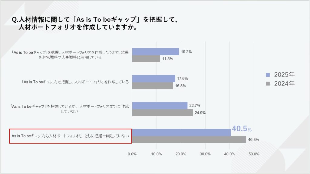 本設問では、「As is To beギャップおよび人材ポートフォリオどちらも把握・作成できていない」という回答が40.5%と最多となりました。前年度調査の46.8%から低下しているものの、半数近い企業で課題視されている状況です。