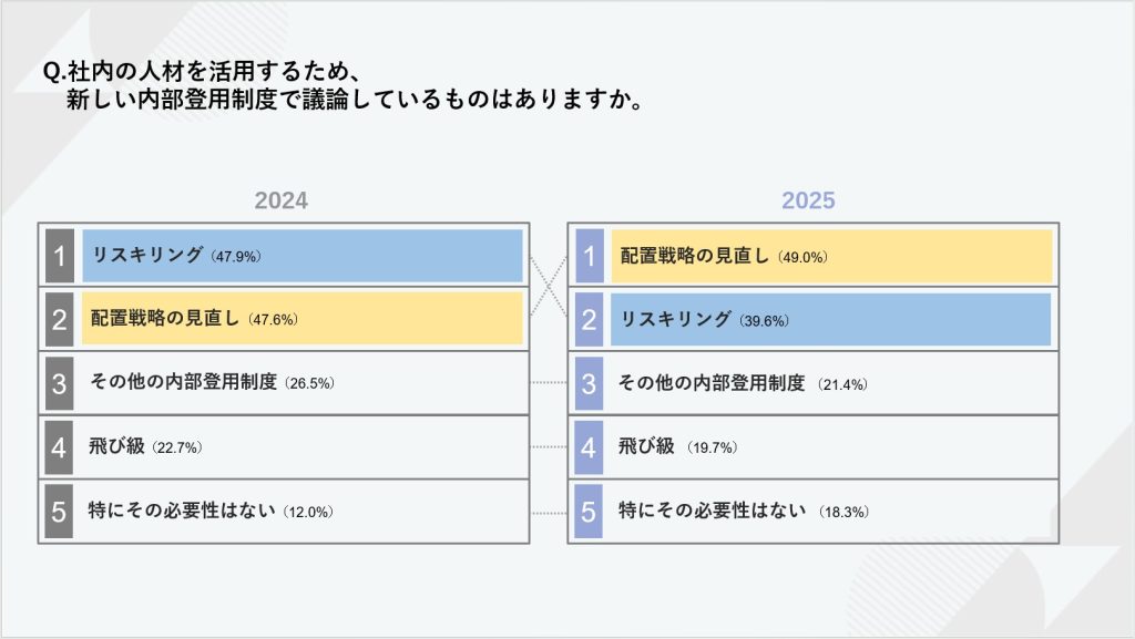 内部登用制度において新しく議論に挙がっている制度としては、前回2位だった「配置戦略の見直し」が49%で1位に位置する結果となりました。