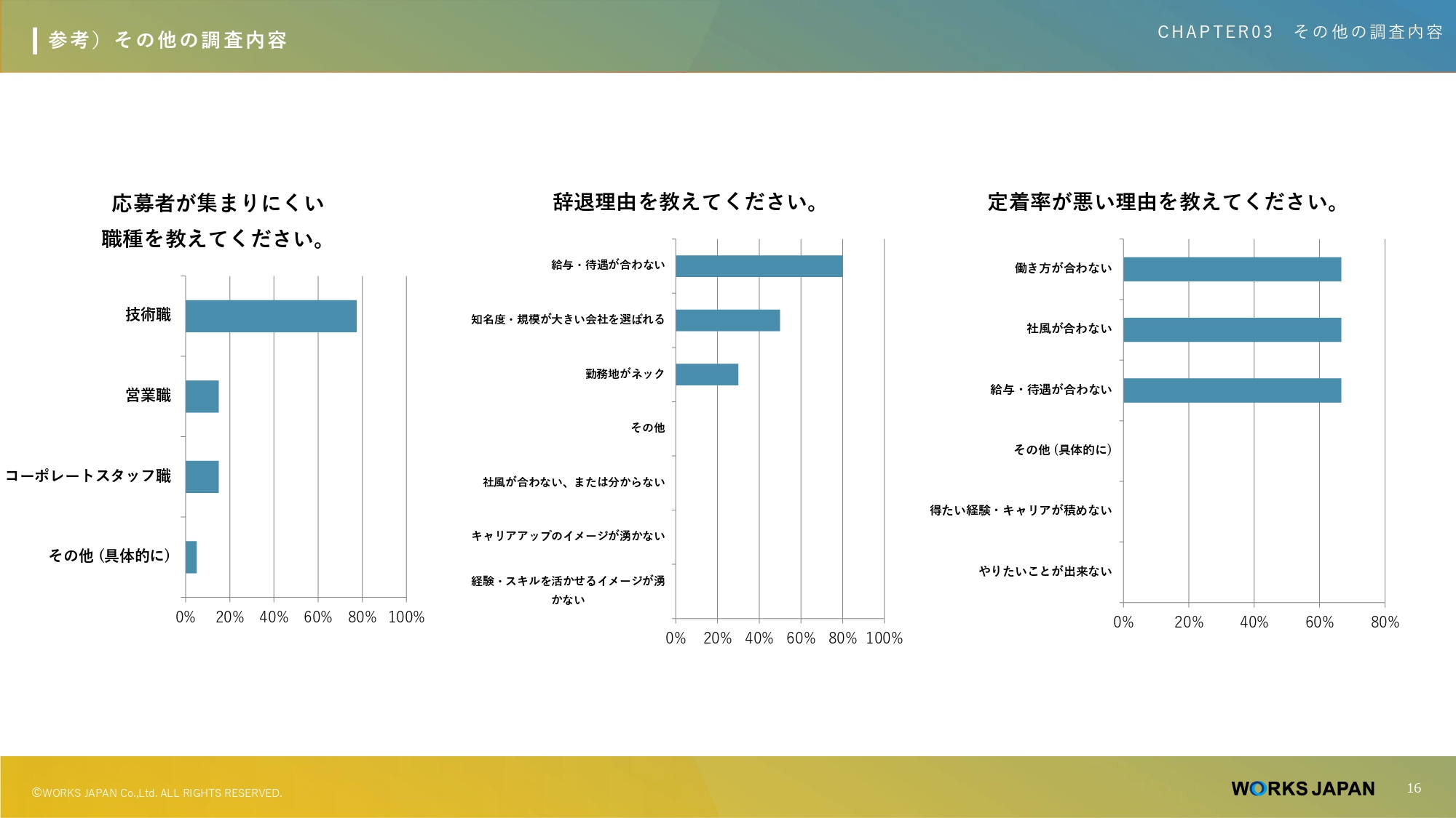 さらに評価制度が入社意欲を減退させているケースもあり、特に「スキルの高さや技術面での成長を評価してくれない」と感じられてしまう評価制度の場合、入社を見送られてしまう懸念も考えられるでしょう。