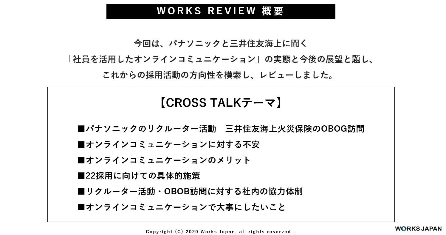 - 本日はありがとうございました。私も櫻井さんと同じで、やはりこのwithコロナの時代で、どうやって学生に情報発信をして、お互いに理解をして、そして不安なく当社にきていただけるのか、すごく悩みが多いです。今日ご覧いただいている採用担当の方も、きっと同じなのではないかなと思っています。ぜひ、今後もいろいろ情報交換をさせていただいて、学生が不安のない就職活動が送れるような、そんな環境を作っていけたらいいなと思っています。本当に今日はありがとうございました。