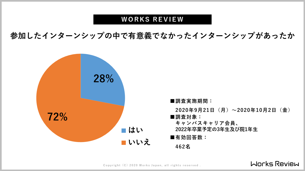 第一部では椎名さんからここまでの22卒採用をどのように見てらっしゃるかをお伺いしたいのですが、まずは9月末から10月にかけて弊社で調査した学生アンケートをご覧いただきます。「参加したインターンシップで有意義なかったものはありましたか」という設問に対して、28%の学生が「有意義でないものがあった」と答えています。
