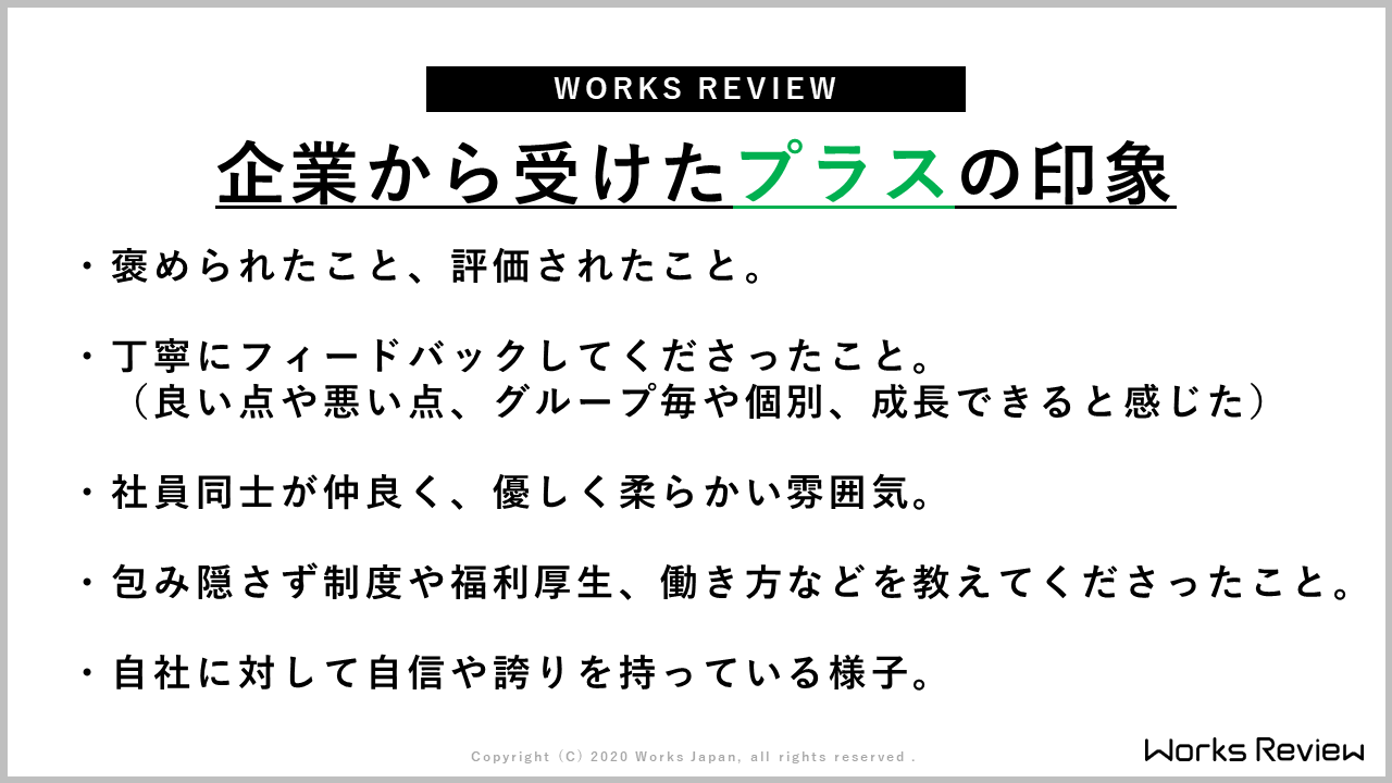フィードバックや座談会などサポートが多かった企業は「良い」という印象はもちろんありますが、個人的にはワークの時間の長さや、ワークが困難だった企業のインターンシップが、特に好印象で残っています。企業体験・仕事体験のためのインターンシップだと感じているので、穴埋め問題のような簡単なワークだと、自分のためにならないと思ってしまいます。かなり難しくても長くても、実際あった仕事のテーマに沿ってワークをやることが、個人的には楽しくて、実際に仕事体験もできて良かったっていう印象があります。