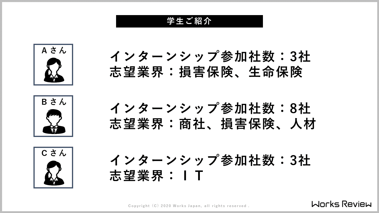 - ありがとうございました。続いてBくんいきましょう。まずは「良かった点」、どんなインターンシップがありました?
