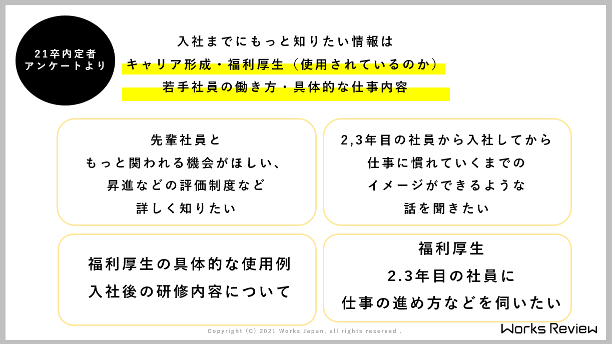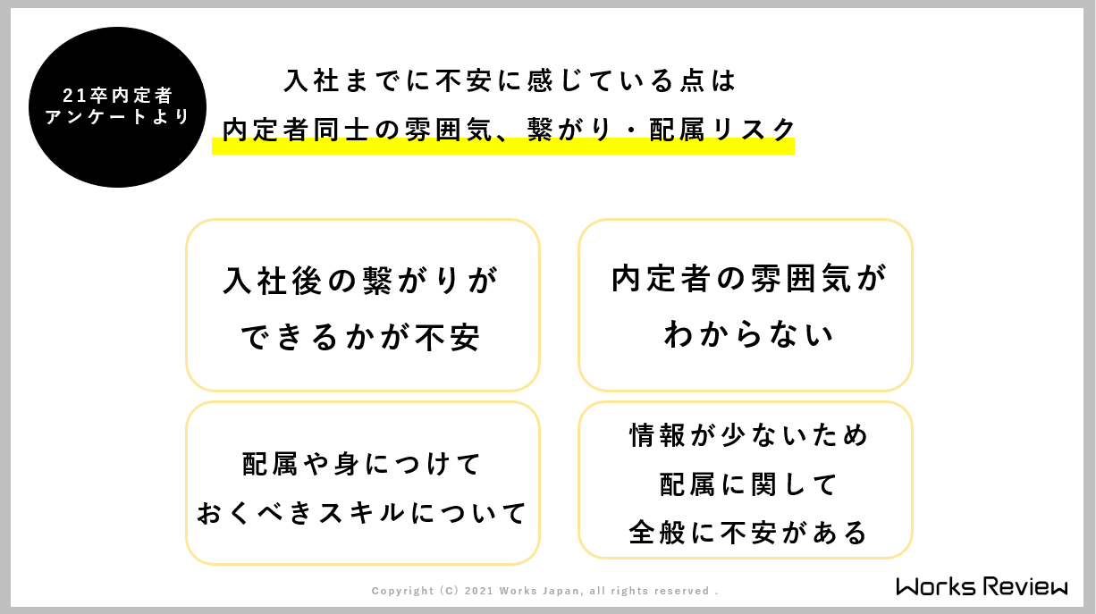 そうですね、「率直に知りたいことは何ですか、心配なこと、これから入社に向けて知りたいことは?」というアンケートで、基本的に、「1年目に苦労するであろうことを知りたい」とか、あとは「研修はどんなことをやりますか?」とか、入社してからのリアルなイメージを掴んでいきたいという回答が多かったです。