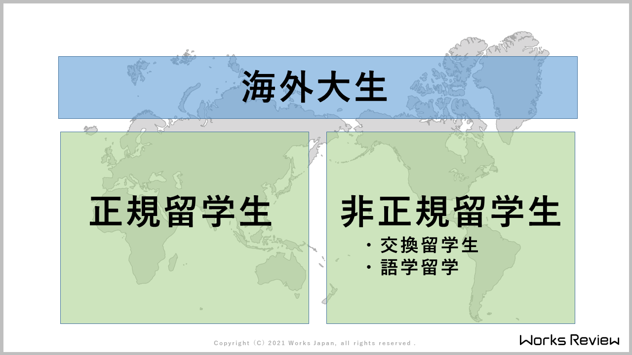 海外大生は大きく分けると、正規留学生と非正規留学生。正規留学生は、日本の大学や高校を卒業して海外の大学に籍を置いている方のことを指します。それ以外を非正規留学生と呼ぶんですが、こちらはポピュラーなところだと交換留学だとか、あとは語学留学だとか、どちらかと言うと1年未満の短期の方を指しています。