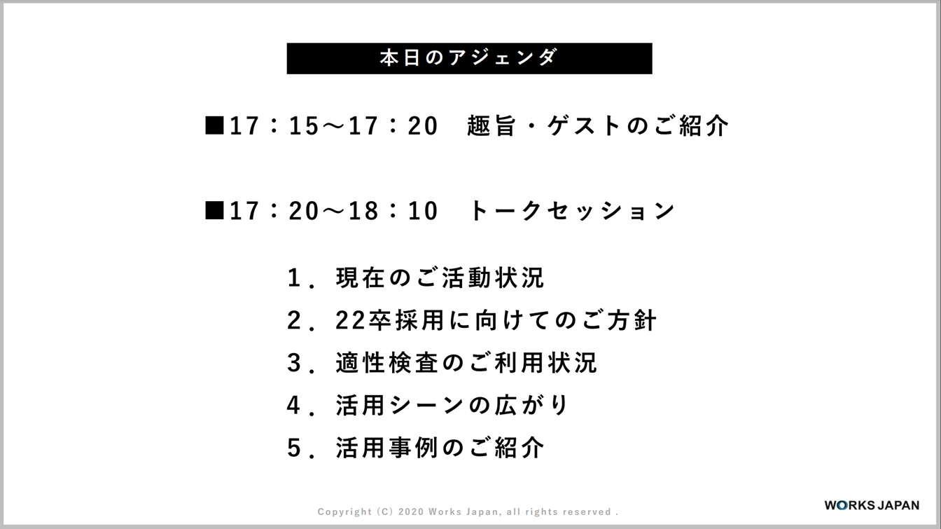 - はい。視聴者のみなさまの社名を見るたびに、我々より進んでいるのではないかと思ってしまいましたが、適性検査の活用については修正しなければいけないとあらためて思うことがたくさんありましたので、参加させていただいてすごくいい経験になりました。本日はありがとうございました。