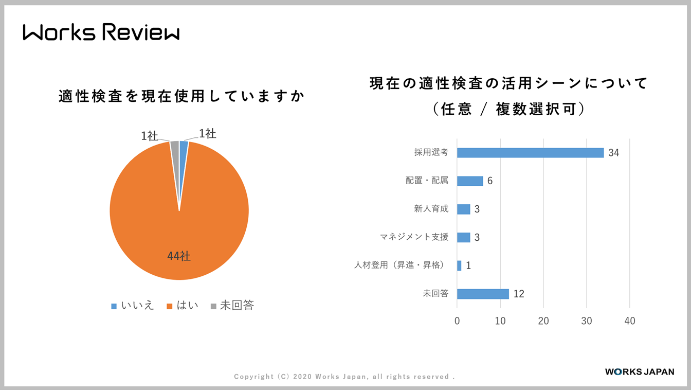 ここで今日ご予約いただいている方々の事前のアンケートをご紹介します。本日は46社の企業様で回答数は56名です。全社で適性検査を利用しています。適性検査の活用シーンについて、複数回答可でお答えいただいていますが、採用選考はもちろん、配置・配属や、新人育成、マネジメント支援でも活用しているという方がいました。次に、採用選考時の活用シーンについて、こちらも複数選択可でお答えをいただいております。基本的に書類選考が多くはなりますが、それに続いて面接の見極めでの参考資料という点もありますし、インターンシップでも活用している企業があるようです。それ以外には、リクルーター、面接官とのマッチングもありますし、学生フィードバック、内定者フォローにも、数は少ないですが活用しているということでした。今後活用していきたいシーンに関しては、配置・配属に使っていきたいという回答をいただいています。続いて新人育成やマネジメント支援、人材登用に適性検査を活用していきたいというお答えをいただいております。