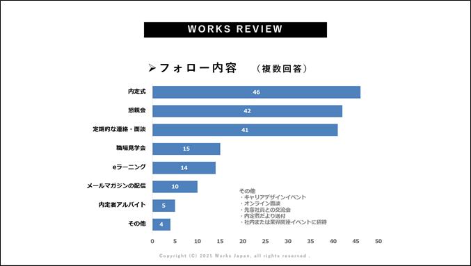 - 最後、「フォロー内容について」です。ほぼ全ての企業で内定式や懇親会を実施されています。特に、「実施をしていて好評だった内容」として、内定前は年齢の近しい方との面談、内定後はマネジメント層といった経営について語っていただける方との面談の機会を設けたり、少人数の座談会は、学生からも大変好評を受けていたというご意見をいただきました。一方で、最近流行りの「Zoom飲み会」を実施されている企業も見受けられましたが「実施してみての難しさを感じました」という意見もいただいているので、このあたりは後ほどゲスト企業にお伺いできればと思います。
