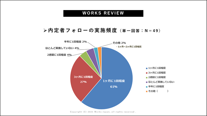 - 続いて、「内定者フォローの実施頻度」について、約6割の企業が「1か月に1回程度」、「3か月に1回」も含めると約9割の企業がフォローを実施されていると結果となりました。定期的に学生のフォローをされる企業が多いということがわかると思います。