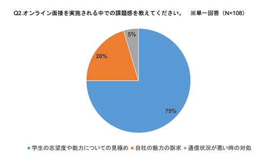 - 続いて、オンライン面接を実施される中での課題感について。75%の方が「学生の志望度や能力についての見極め」、20%の方が「自社の魅力の訴求」、5%の方が「通信状況が悪い時の対処」という結果になりました。