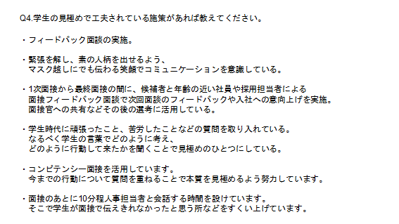- 最後に、学生の見極めで工夫されている施策について自由記述でご回答を頂いております。面接中での取り組みとして、質問内容を学生の行動が分かるような聞き方にすることや、面接後にフィードバック面談を実施して学生から発信して頂くような工夫が見受けられます。