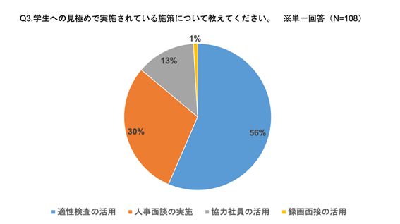 - 続いて、学生への見極めで実施されている施策について。56%の方が「適性検査の活用」、30%の方が「人事面談の実施」、13%の方が「協力社員の活用」、1%の方が「録画面接」の実施という結果になりました。オンライン面接では志望度や能力の見極めが難しい分、面接以外の手法も併せて見極めを行っていることが伺えます。
