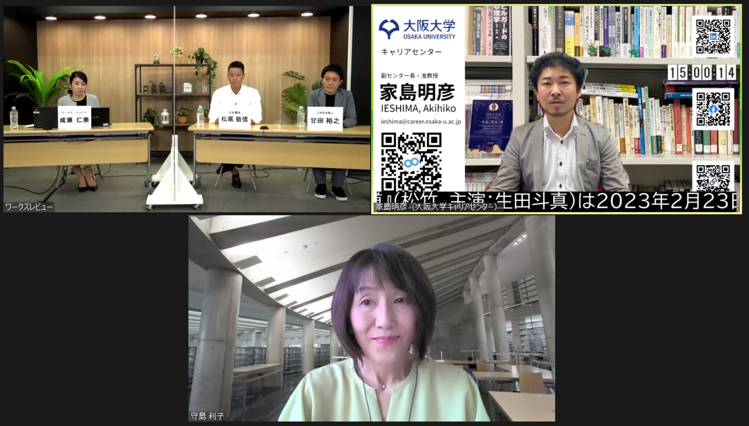 最後のご紹介は、東京工業大学学生支援センター未来人材育成部門特任教授キャリアアドバイザー・守島利子様です。守島様は大学院修了後、人事教育分野のコンサルティング会社にご入社、その後、短期大学の講師、公立大学のキャリアカウンセラーを経て2010年から現職でいらっしゃいます。修士学生を対象としたキャリアの授業を担当され、全学の学生を対象としたキャリア相談もされています。