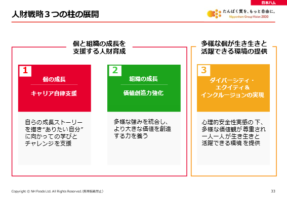 - 皆さん日本ハムと聞いて何を思い出しますか。私はシャウエッセンですね。食肉加工業、日本では最大手で売上高は1兆円を超えています。昨年は人的資本経営元年と言われ、大手企業では人事の仕組みを変える試みが多数なされました。人的資本の中で、日本ハムの人事が何を取り組んでいるのか、伊瀬知さんの講演を聞きながら、みんなで議論していきたいと思います。