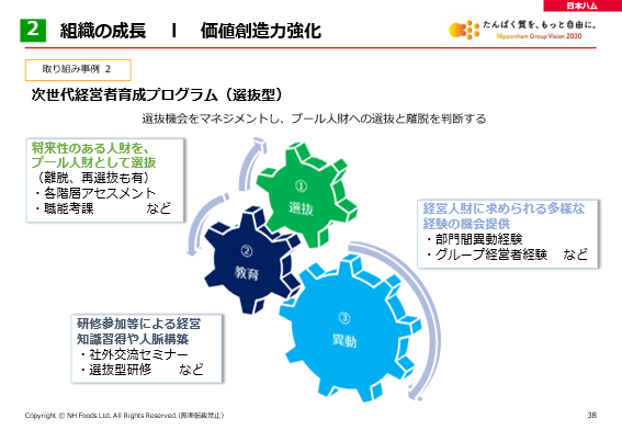- その他にタレントマネジメントとして次世代経営者育成に取り組んでいます。人財アセスメントで光っている人の中から選抜型研修を受けてもらう仕組みです。それを各階層で実施していて、他に360度評価や役員面談をしています。次世代経営者の候補者は離脱や再加入があり、何度でもチャレンジできる制度です。また、経営者に求められる5要件「誠実、献身、熟慮、挑戦、共感」を社内で議論して作りました。