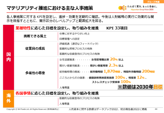 ダイバーシティ・エクイティ&インクルーションについて。多様なキャリア・働き方を選べること、多様な個を活かすことが大切で、女性活躍支援やキャリア採用にも取り組んでいます。さらに心理的安全性を実感できるようにするために、健康経営の実践・実現に取り組んでいます。KPIとして、総労働時間1,870時間、時間外労働時間200時間を定めています。ほかに、女性管理職比率は20%以上、障がい者雇用比率2.3%以上、健康診断再検査率100%、喫煙率12%、ストレスチェック受検率100%をKPIとしています(数値は国内対象で2030年の目標値)。