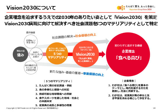- 3年前に2030年のありたい姿として「タンパク質を、もっと自由に。」を掲げる「Vision2030」を策定しました。そして、タンパク質の安定調達・供給、食の多様化と健康への対応、持続可能な地球環境への貢献、食やスポーツを通じた地域・社会との共創共栄、従業員の成長と多様性の尊重といった5つのマテリアリティを「Vision2030」実現に向けて解決すべき社会課題と位置づけました。中期経営計画2023は今年最終年度ですが、企業価値の最大化のために、事業戦略、サスティナビリティ戦略があり、それをDX戦略で下支えしていこうという考え方です。今年、北海道の北広島市に新しくHOKKAIDO BALLPARK F VILLAGEを開業しました。地域との共創共栄の一つです。ぜひ一度、足を運んでいただければと思います。