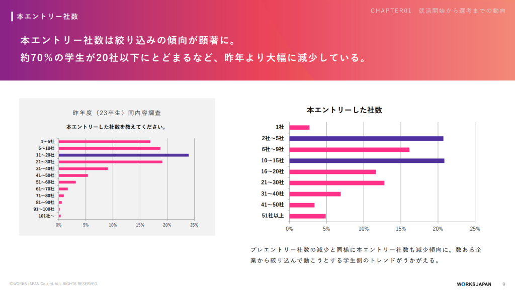 24卒では学生が応募企業を厳選していることもあり、学生1人あたりの本エントリー数が減少しています。