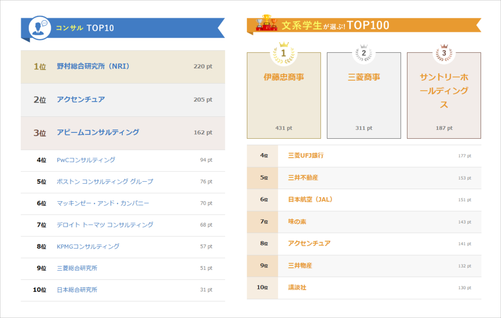 アクセンチュア株式会社は、先日公表された中間結果においてコンサルティング部門2位、文系総合8位、理系総合23位にランクインする結果となりました。