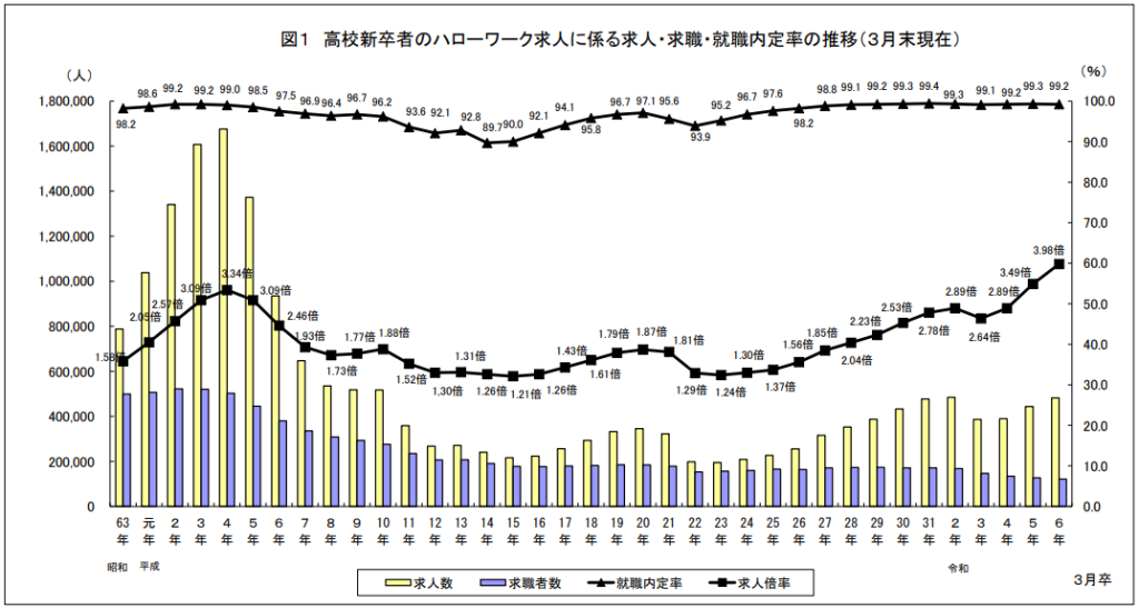 参考:「令和5年度高校・中学新卒者のハローワーク求人に係る求人・求職状況」(厚生労働省)