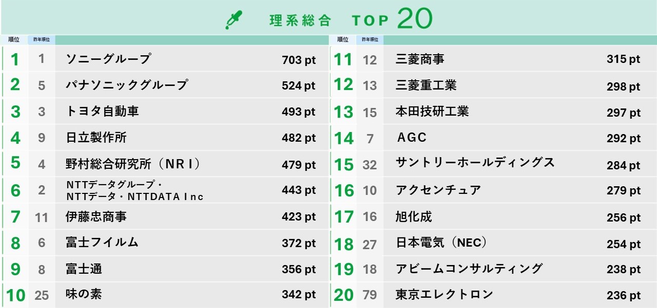 理系総合ランキングでは、ランキング上位企業の顔ぶれに大きな変動はなく、メーカーやIT・ソフトウェア関連の企業が名を連ねました。