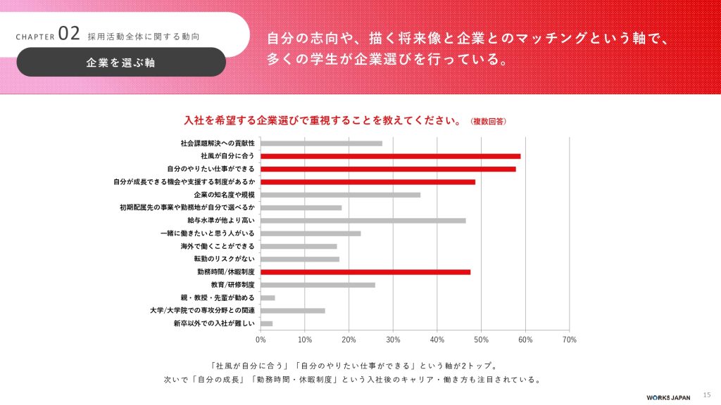 企業選びで重視する項目を問う設問では、半数以上の学生が「社風が自分に合っているか」「やりたい仕事ができるか」と回答しており、次に「自分が成長できる機会や支援する制度があるか」が続きました。