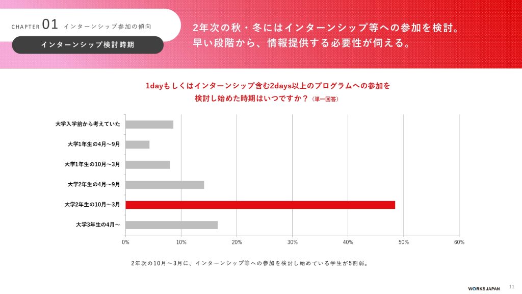 インターンシップへの参加を検討し始めた時期については、「大学2年生の10月~3月」と答えた学生が最多となり、企業情報の収集に向けて早期から動き出している様子が見て取れます。