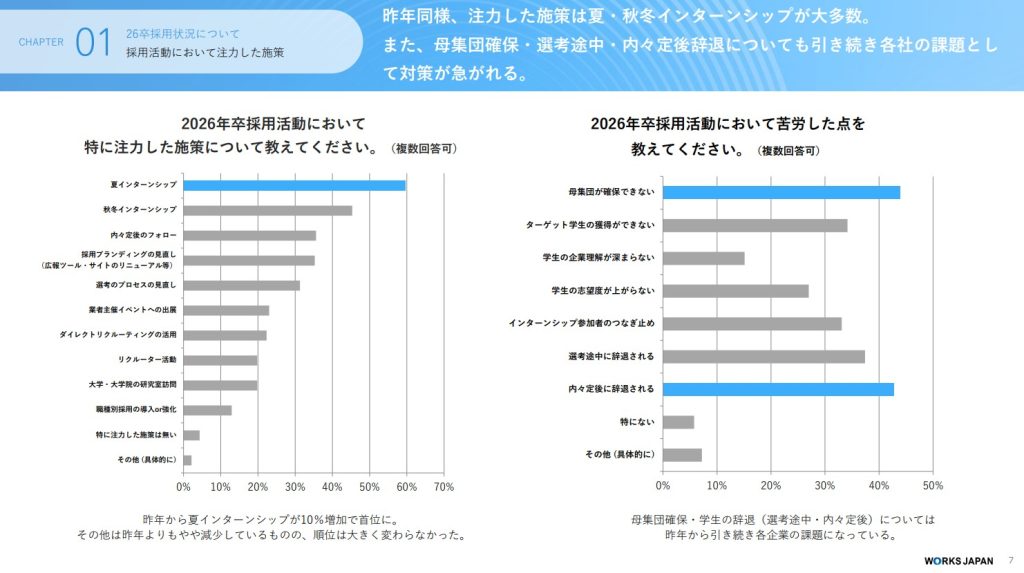企業はインターンシップをはじめとした学生との接点づくりに注力しており、特に夏のインターンシップは前年より約10ポイント増加するなど、母集団形成のスタート段階として重視されている様子がうかがえます。