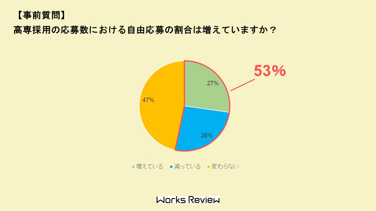 高専生採用における自由応募の割合を問う事前アンケートでは、約半数以上の企業が「増えている」もしくは「減っている」と回答しており、自由応募における各社の状況に変化が生じている様子がうかがえます。