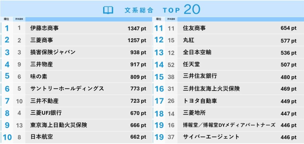 1. 文系総合:伊藤忠商事が5年連続の首位獲得。幅広い業界に支持が分散